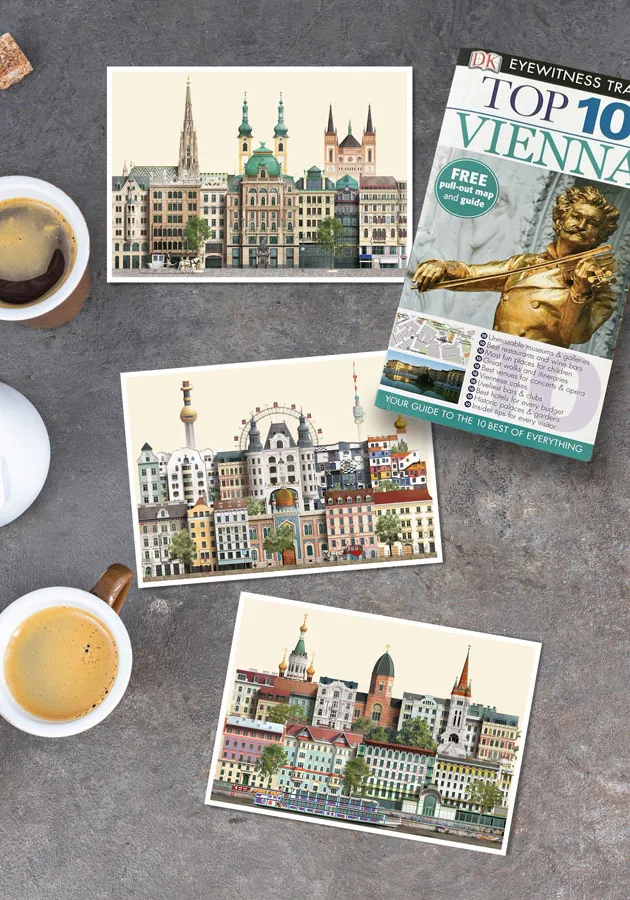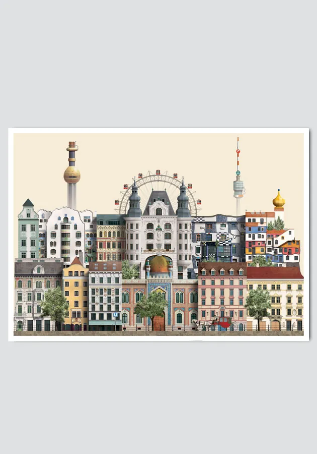 Our series of A5 postcards give you the soul of Vienna in three different settings. This series feature many of the most beloved landsmarks, put together in different settings capturing the characteristic charm and atmosphere of Vienna.Â