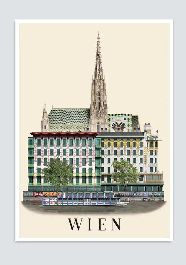 Our series of traditional postcards give you the soul of Wien in nine different settings. This series feature many of the most beloved landsmarks of Vienna, put together in different settings capturing the characteristic charm and atmosphere of the Austrian capital.Â